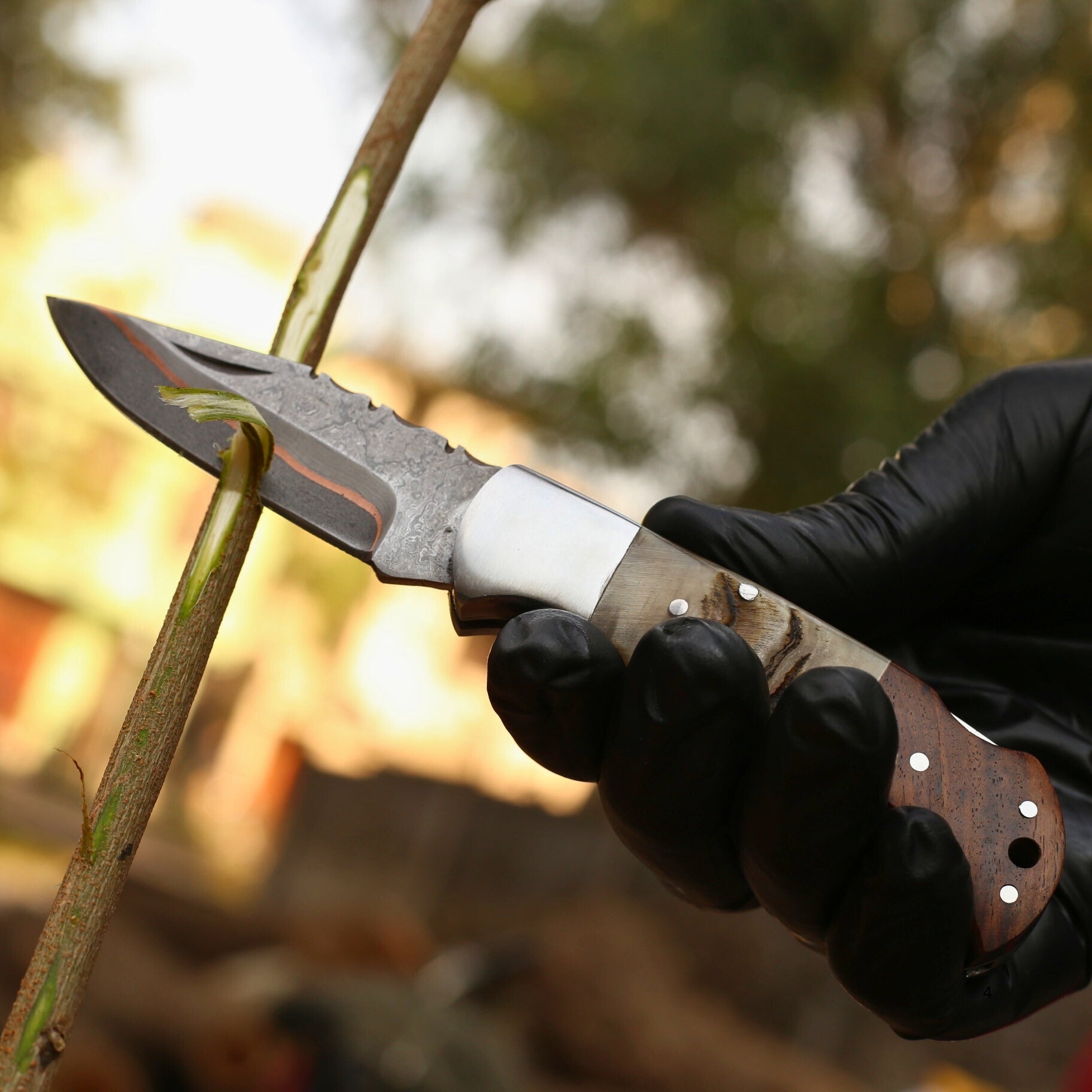 Crafted with precision, this handmade folding knife features stunning copper Damascus steel with distinctive layered patterns that make each blade truly one-of-a-kind. The Rose Wood and Ram handle provides a classic, comfortable grip while adding timeless elegance. Perfect for collectors and enthusiasts who appreciate fine craftsmanship, this knife serves as an exceptional personalized gift for anniversaries, groomsmen, or holiday celebrations. The folding design ensures portability and safety, while the Damascus steel construction delivers both durability and visual appeal. An heirloom-quality piece that combines functional artistry with meaningful gifting.