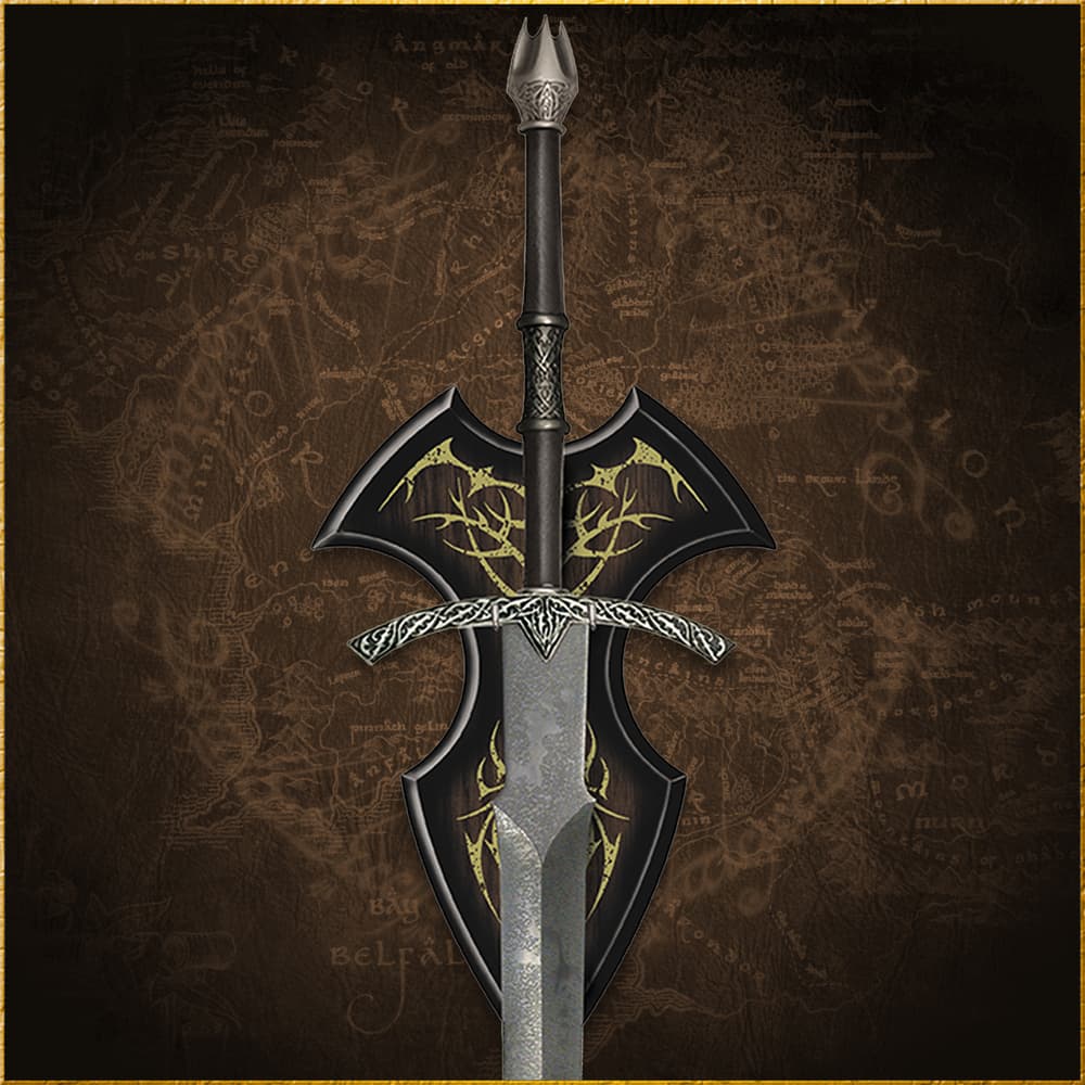 La empuñadura está revestida de cuero genuino, lo que garantiza un agarre cómodo y seguro tanto para blandirla como para exhibirla. Como prueba de su autenticidad, cada espada incluye un certificado de autenticidad en pergamino que certifica su condición de auténtica pieza de colección. La espada también incluye una placa de madera a juego para la pared, que le permitirá exhibir esta impresionante pieza en su hogar, donde aportará un aire de majestuosidad y amenaza de la Tierra Media.