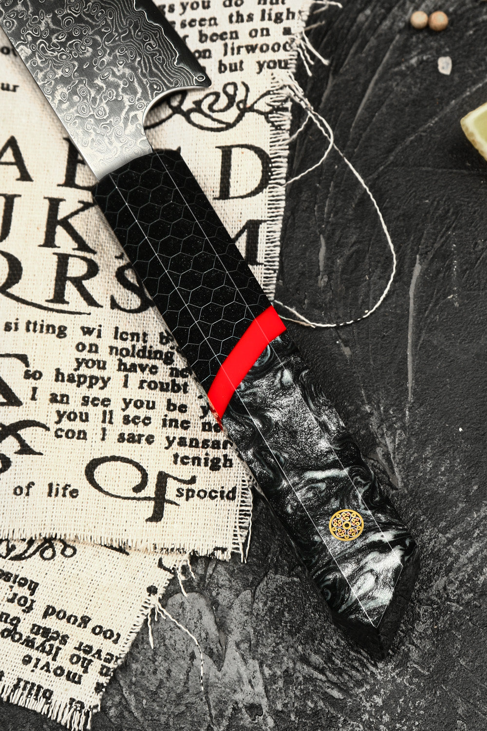 The Chef Knife, Japanese Damascus handle, is a work of art in and of itself. It is made of honeycomb aluminum mesh and resin, striking the ideal mix between toughness and beauty. Because of the ergonomic handle’s design, you can quickly chop and make intricate cuts thanks to a secure hold. The honeycomb aluminum mesh’s delicate pattern provides a hint of visual mystery and raises the knife’s overall attractiveness.