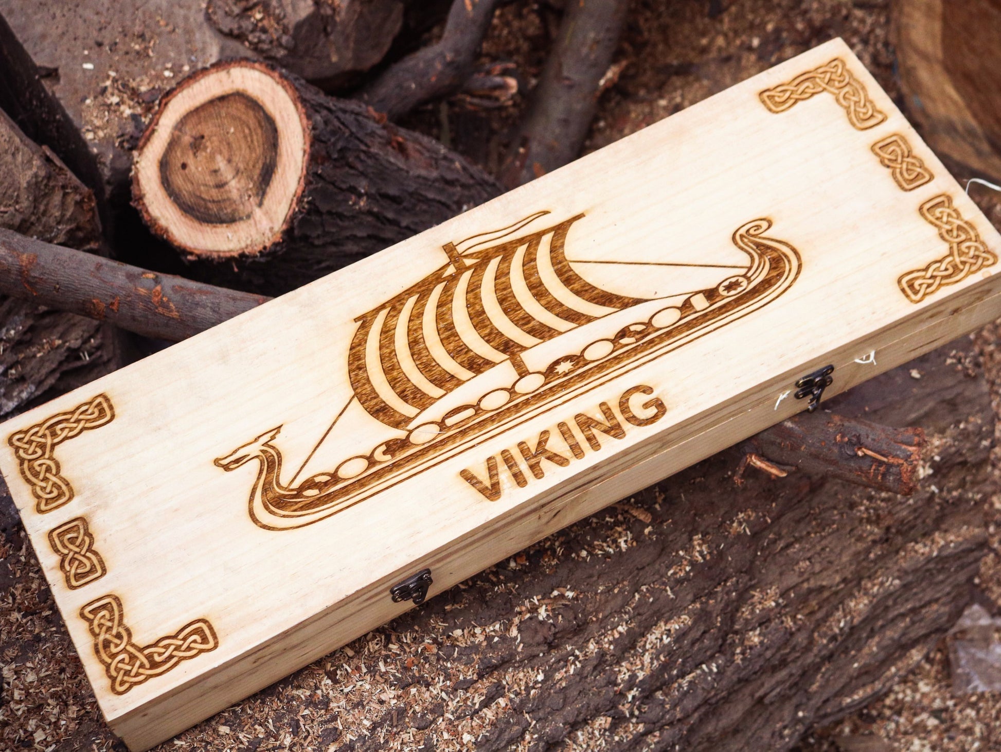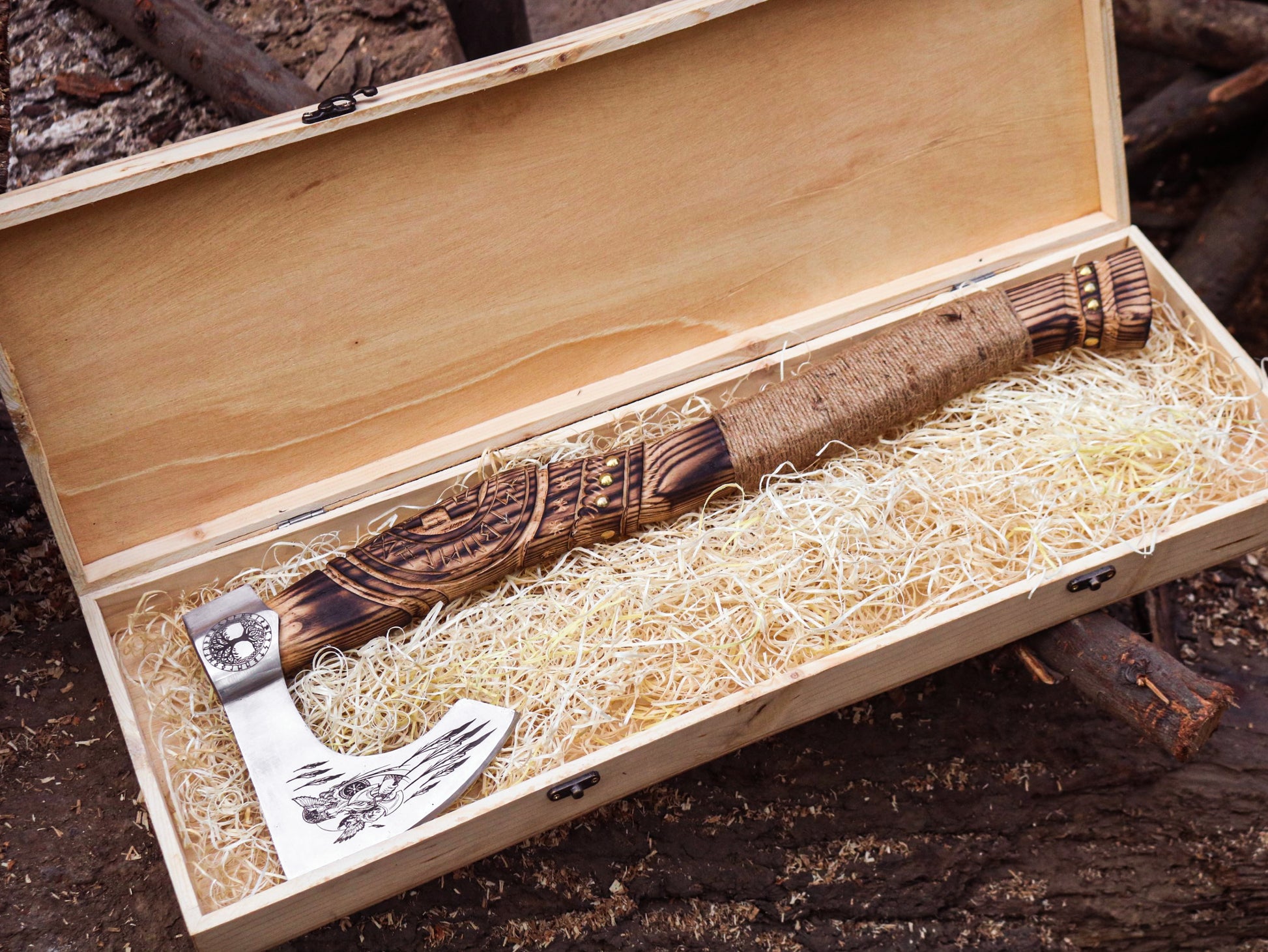 Unleash the power of the Viking Odin Axe – a masterpiece of craftsmanship and strength, elegantly presented in a handmade wooden box. This handcrafted axe is more than a weapon; it's a symbol of Norse mythology and history, making it an elite gift for special individuals.