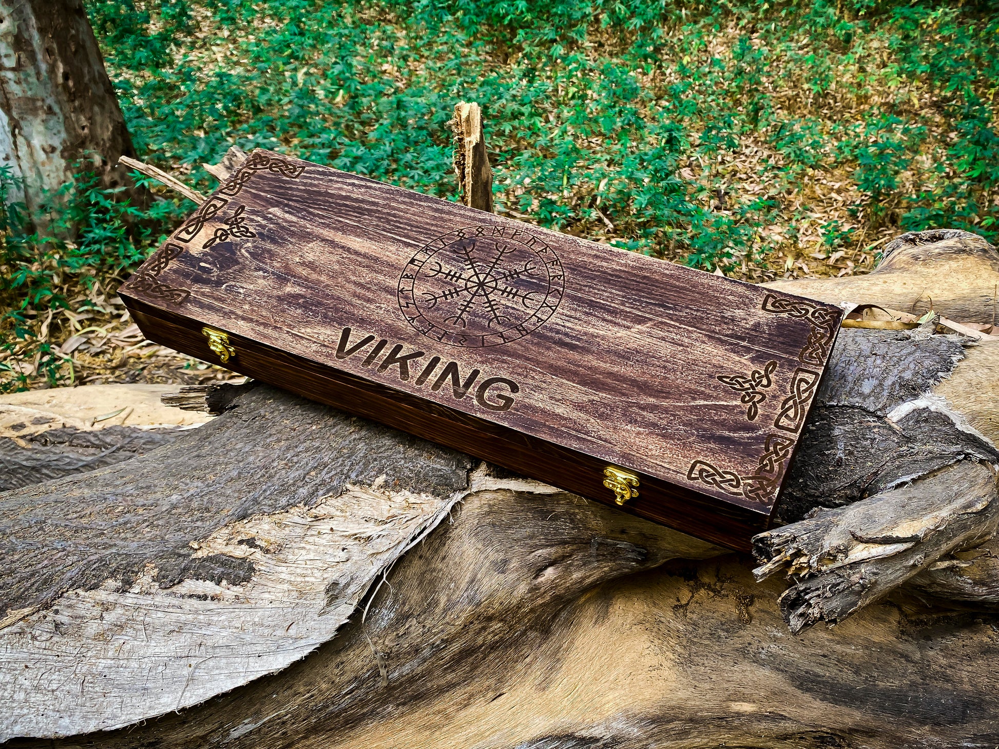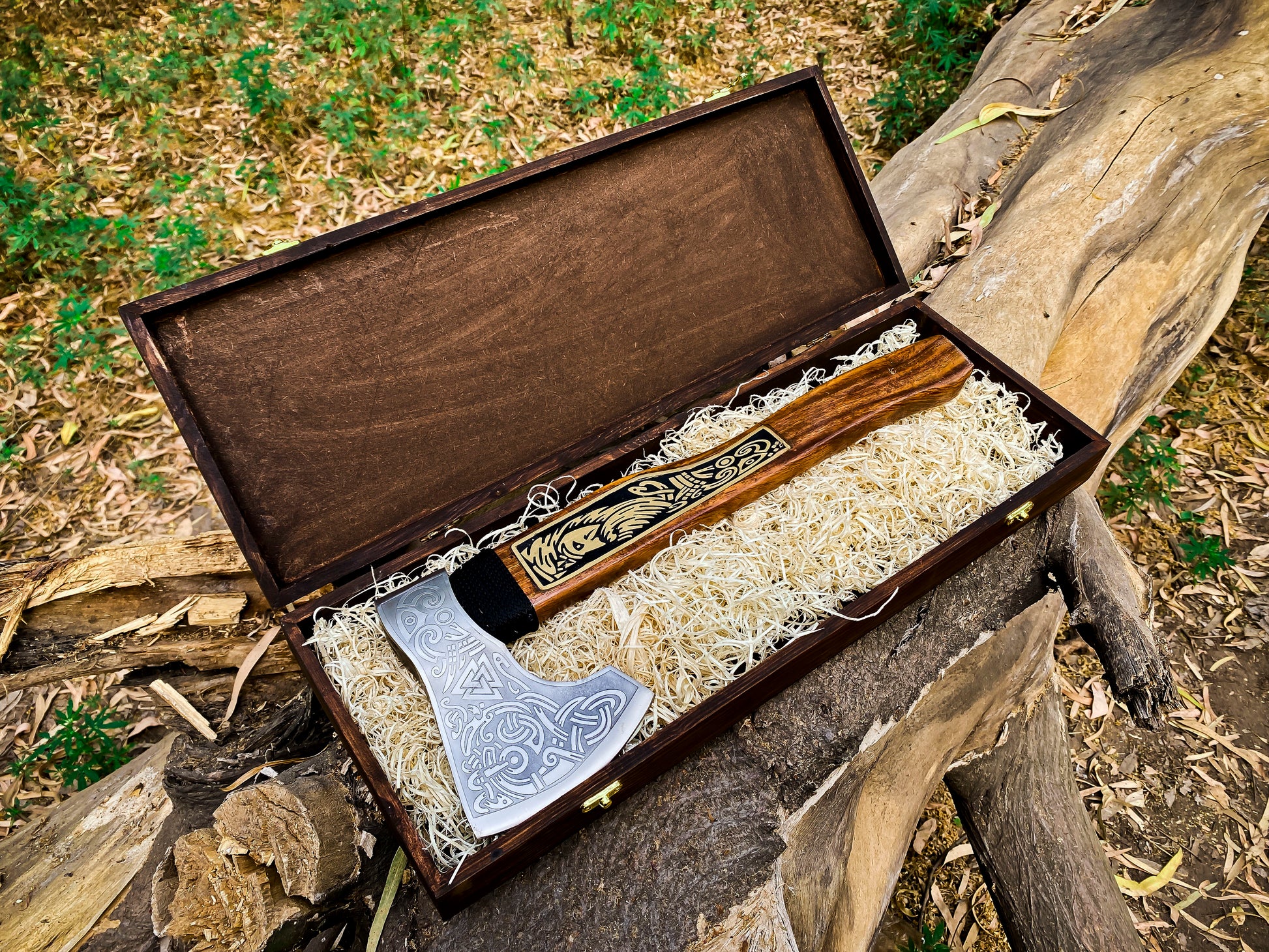 Unleash the power of the Viking Odin Axe – a masterpiece of craftsmanship and strength, elegantly presented in a handmade wooden box. This handcrafted axe is more than a weapon; it's a symbol of Norse mythology and history, making it an elite gift for special individuals.