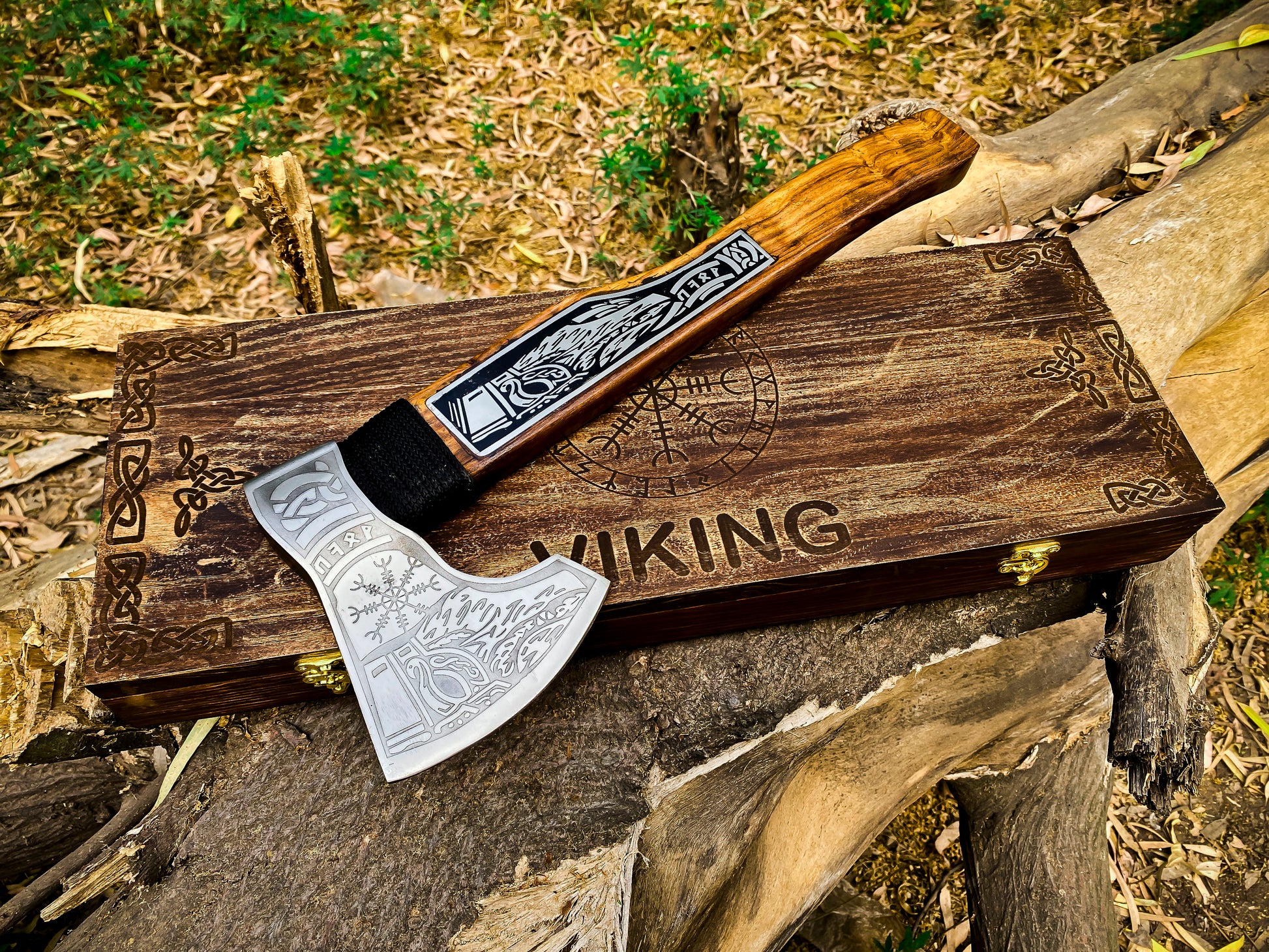 Unleash the power of the Viking Odin Axe – a masterpiece of craftsmanship and strength, elegantly presented in a handmade wooden box. This handcrafted axe is more than a weapon; it's a symbol of Norse mythology and history, making it an elite gift for special individuals.