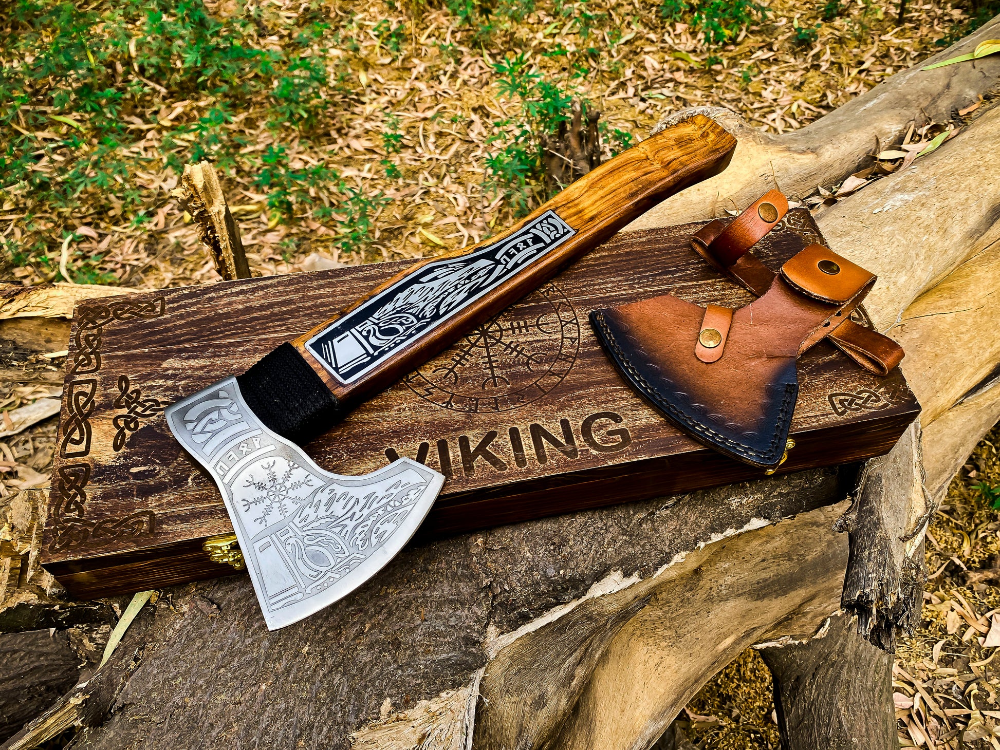 Unleash the power of the Viking Odin Axe – a masterpiece of craftsmanship and strength, elegantly presented in a handmade wooden box. This handcrafted axe is more than a weapon; it's a symbol of Norse mythology and history, making it an elite gift for special individuals.