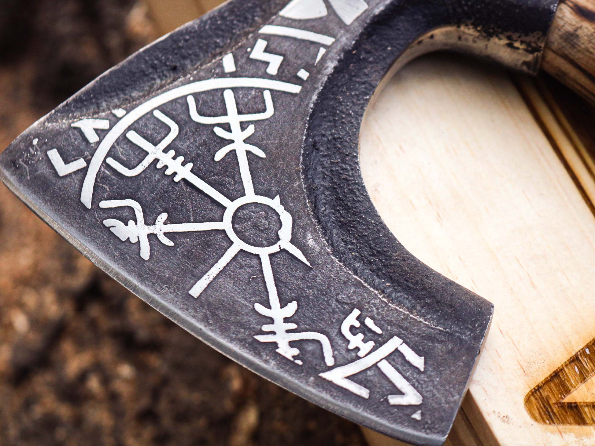 3. Unique Drawing of Odin and His Ravens: Adorned with a one-of-a-kind drawing of Odin "Allfather" and his faithful ravens, Huggin and Munnin, this axe is a visual masterpiece. The intricate design adds a touch of authenticity and mythological allure.