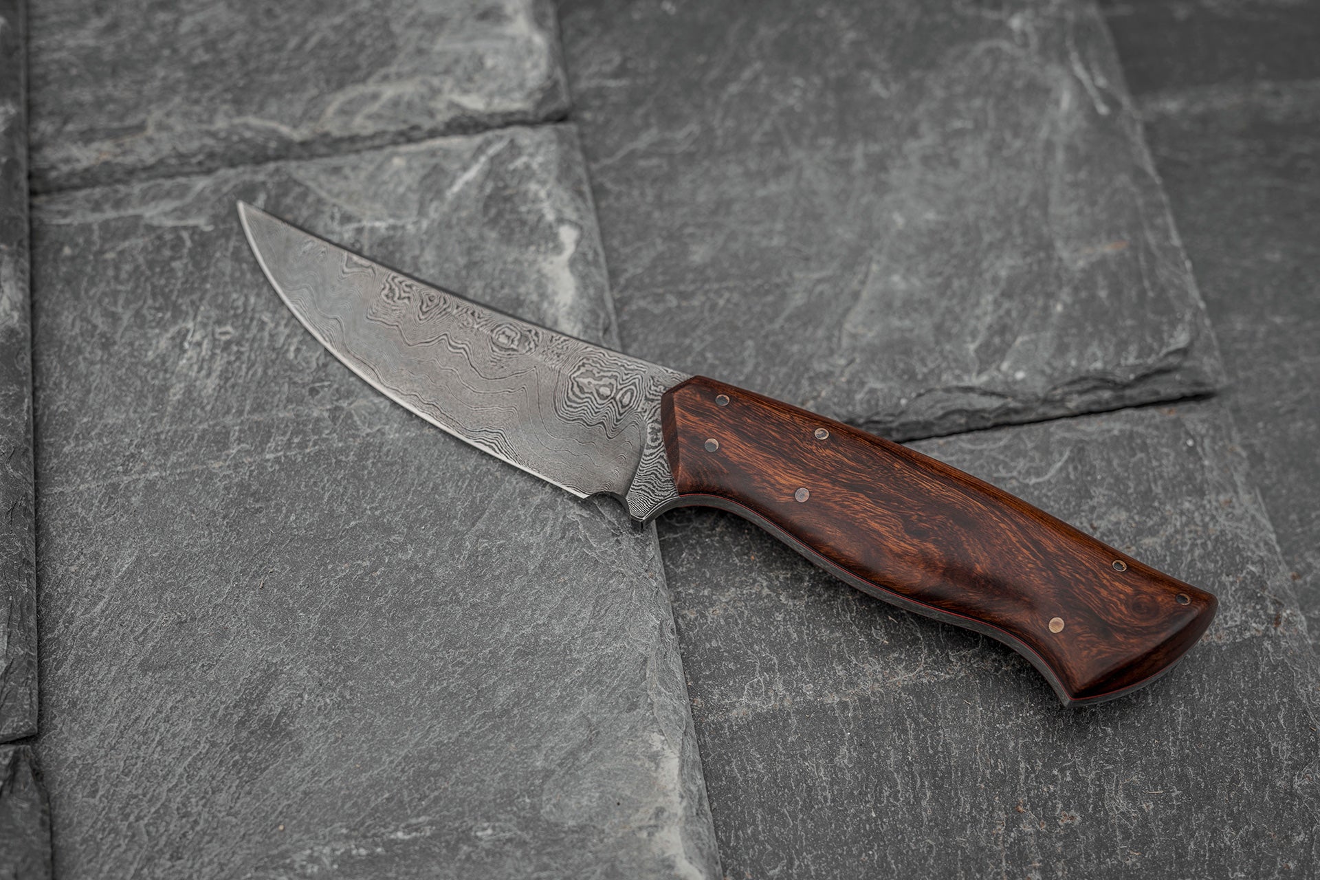 Custom made Bear's Claw shaped knife. Handforged carbon steel Damascus blade