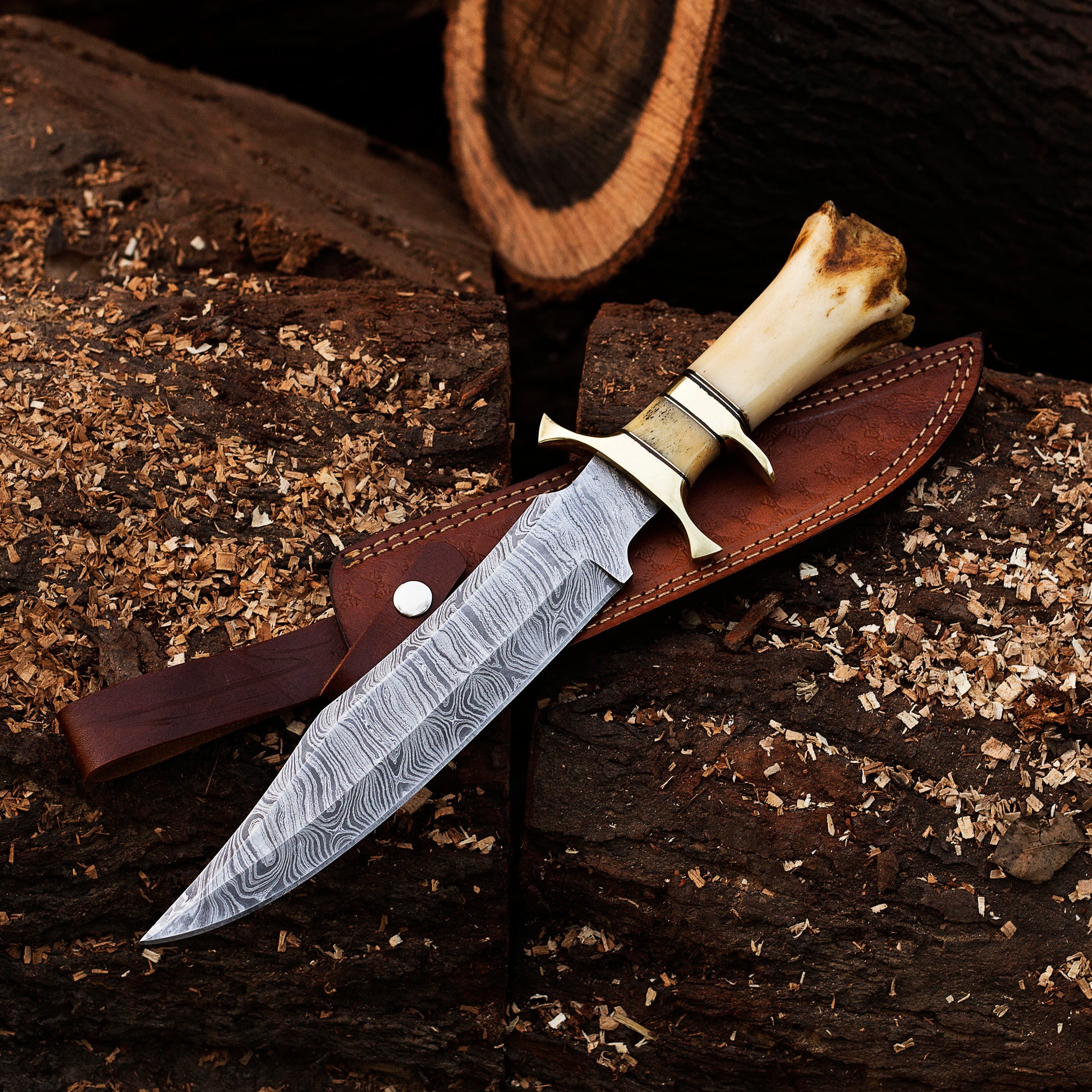 Handmade Damascus Bowie Knife Sharp Blade Camel Bone Handle With Leather Sheath