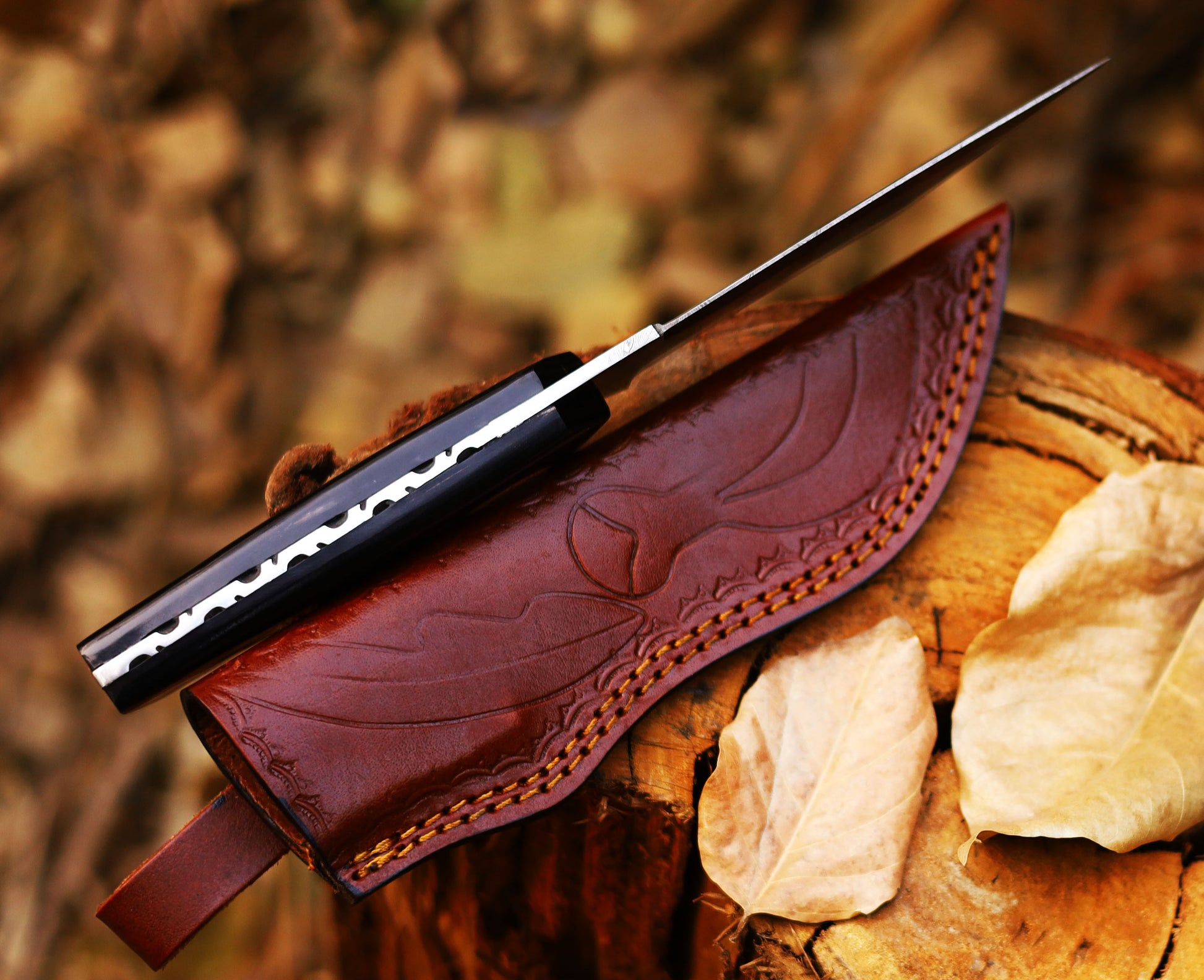 The knife comes with a durable and stylish leather sheath, providing secure storage and easy portability. The sheath’s rugged charm complements the knife’s sophisticated design.