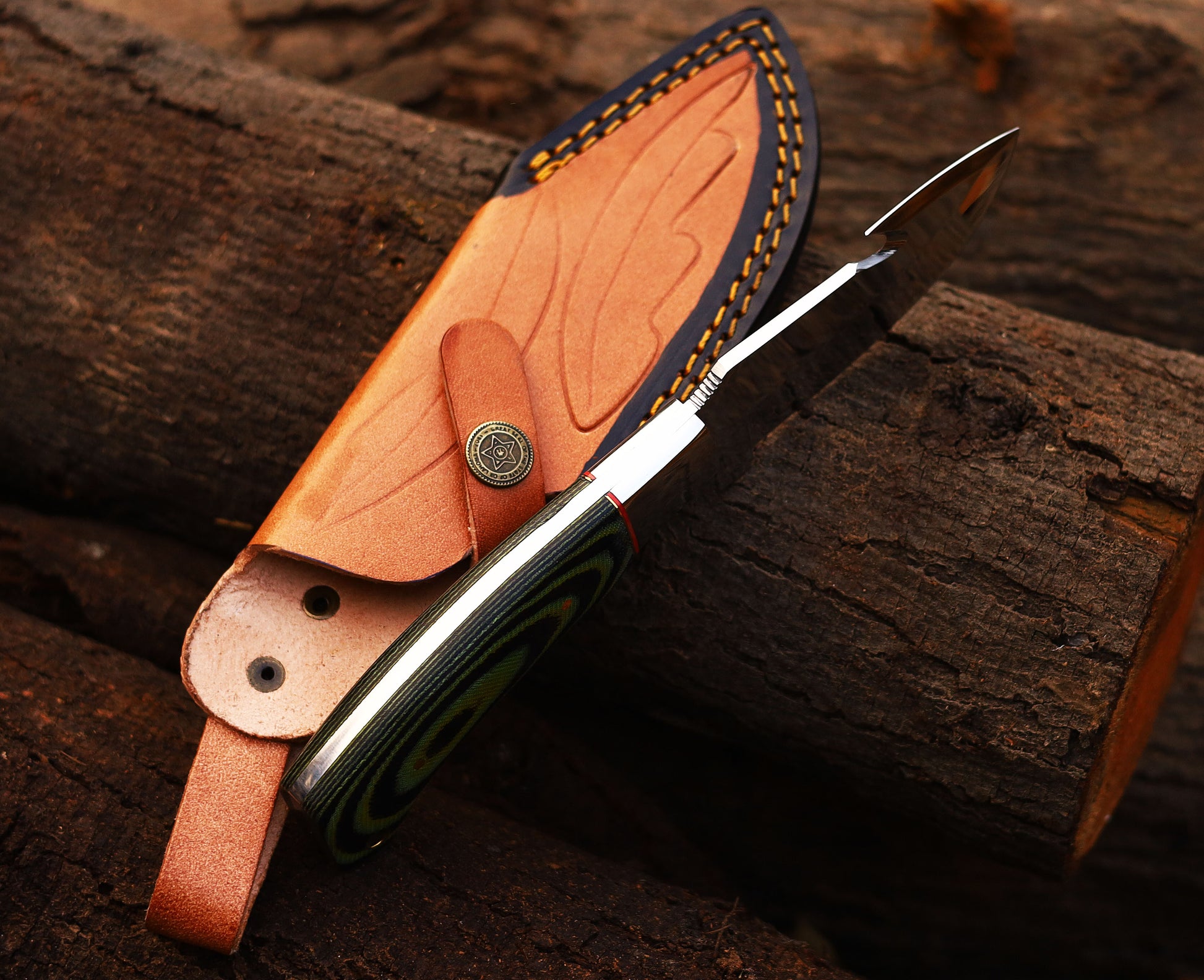 This meticulously crafted knife features a 4-inch high carbon stainless steel blade, ensuring a razor-sharp edge for precise field dressing and skinning. The Micarta handle provides a sleek and modern grip, combining functionality with contemporary aesthetics.
