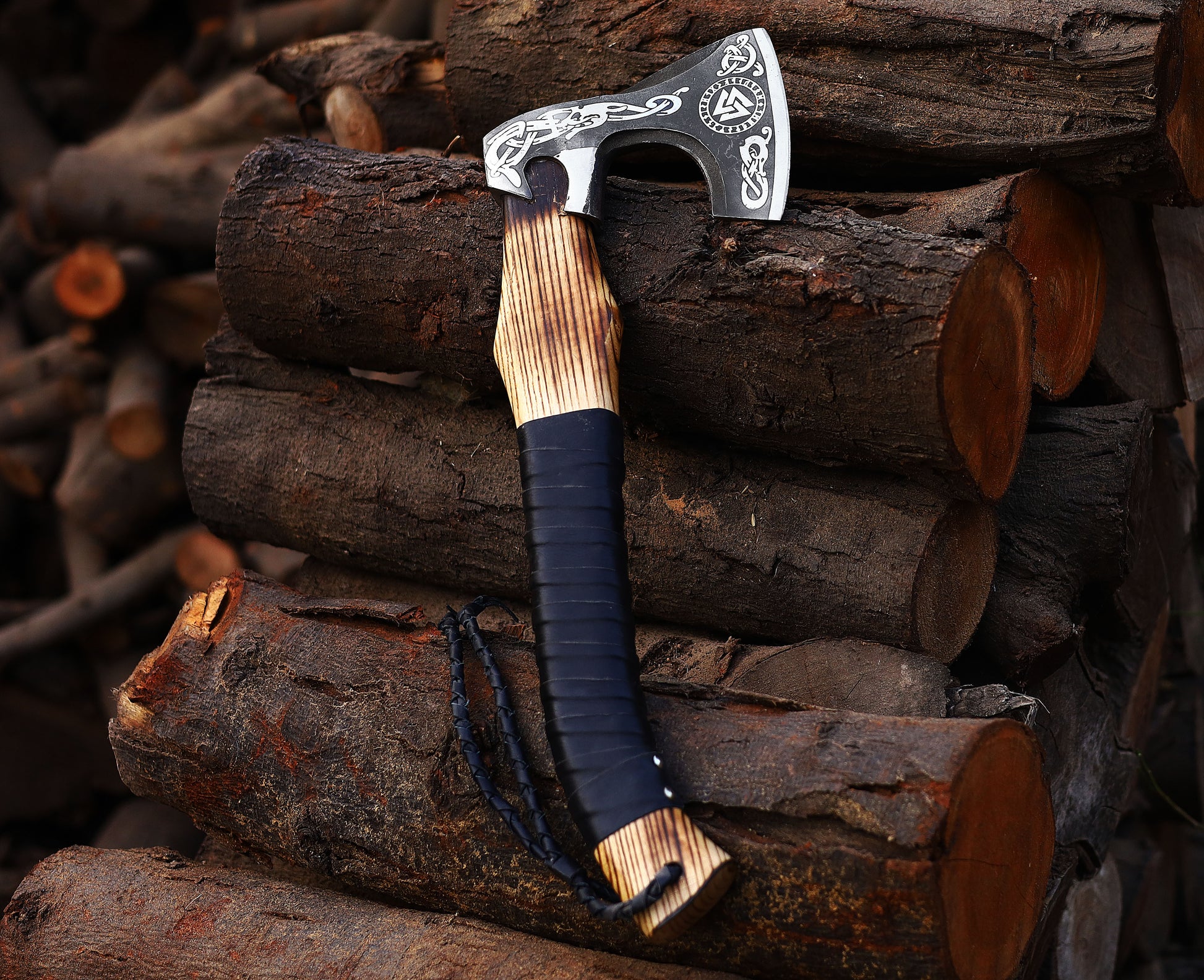 Custom Handmade Viking Etched Axe with Ash Wood Handle, Outdoor Axe, Viking Axe, Forged Carbon Steel Blade, Hickory Wooden Handle, WOODEN BROWN